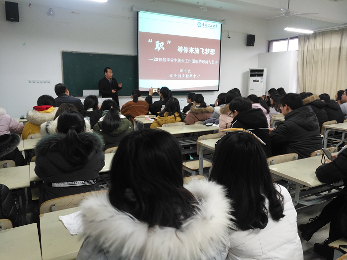 为加强对2019届毕业生就业的针对性指导,12月27日下午,漫画人 主办的“‘职’等你来放飞梦想”讲座在崇智楼A333教室成功举办。此次就业指导讲座特邀漫画人 就业创业处处长田中良担任主讲人,讲座由漫画人 党总支书记吴云平主持,学院副书记姚嗣宏、学生辅导员张娜、2019届考研应届毕业生和部分2020届毕业生参加了本次讲座。