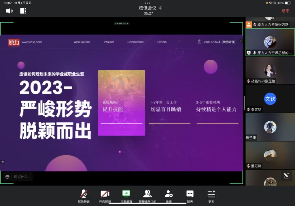 江苏原力数字科技股份有限公司人力资源部工作人员通过线上形式就工作性质、规章制度、薪资待遇及应聘者的具体要求和发展通道进行了讲解,并结合内部员工的工作经历跟同学们分享了经验与心得。宣讲会后,动画专业2023届毕业生对该公司的各项信息及文化理念有了一定的认识与了解,并有部分同学进行了咨询和后续应聘工作。