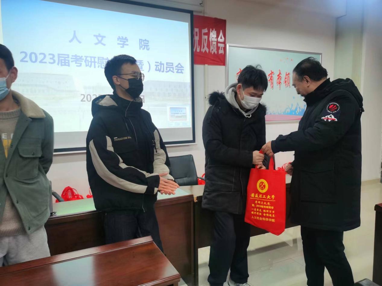 王大贤代表学院表达了对考研学生的关心和祝福,他指出,考研是大家学习生涯的一件大事,要坚持到底,为辛苦的复习备考阶段画上圆满的句号。方胜叮嘱考研学生,距离研究生考试还有两个星期,大家要调整作息,保持良好的生活习惯;要注意身体健康,劳逸结合;要抓住自身的薄弱环节,及时复习巩固提升;要坚定考研必胜的决心、恒心和信心。同时,他要求考研学生诚信考试,不违规违纪,对自己负责,考出真实的成绩和水平。社会工作教研室主任苟延峰博士结合自身的求学经历,就研究生入学考试的科目、题型、作答技巧等为考研学生作考前辅导。会后,学院领导为学生代表发放考研“加油包”,表达了对考研学生的殷殷嘱托。