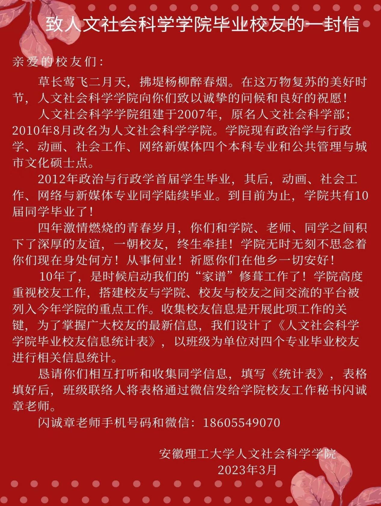 校友是学校事业发展的重要财富,也是学院最生动、最亮丽的名片,漫画人 以加强校友联络为契机,通过撰写信件、统计表格等多种形式,与校友保持沟通交流,多措并举扎实推进校友工作。