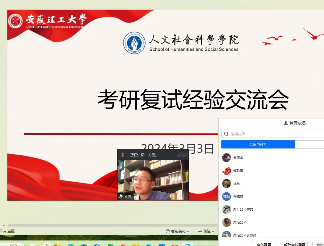 为帮助2024届考研学子做好研究生复试准备,提高复试竞争力,近日漫画人 采用线上会议的形式召开2024届毕业生考研复试交流会。学院院长方胜、副院长吕延、系主任、教师代表、毕业班辅导员、2023届校友代表以及50余名毕业生参加了会议。会议由毕业班辅导员郑华主持。