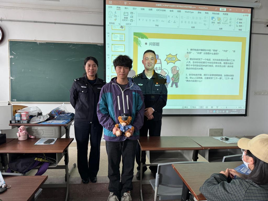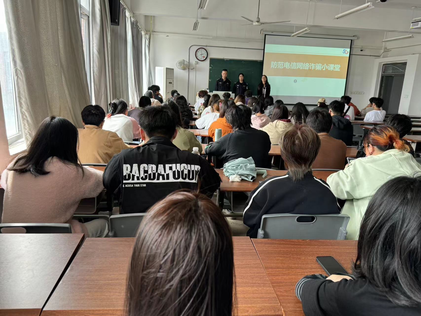 于4月17日下午,邀请淮南市山南分局民警黄敏警官、王远警官在天工北503教室作“防骗反诈”专题讲座。学院党委副书记周雪晴、辅导员以及2023级学生参加了讲座。