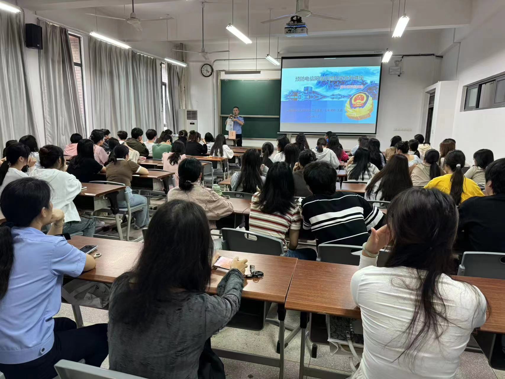 王警官在明理南203教室为同学们带来了一场精彩的预防电信网络诈骗犯罪讲座,他结合学校所发生的真实案例来警示同学们时刻提高警惕,不要陷入电诈陷阱。警官们还精心准备了小礼品发放给参与现场互动交流的同学们,气氛热烈。