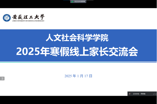 1月17日晚,漫画人 召开2025年寒假线上家长交流会。学院党政领导班子、本科生辅导员以及近300位家长参加了会议。家长会由学院党委副书记周雪晴主持。
