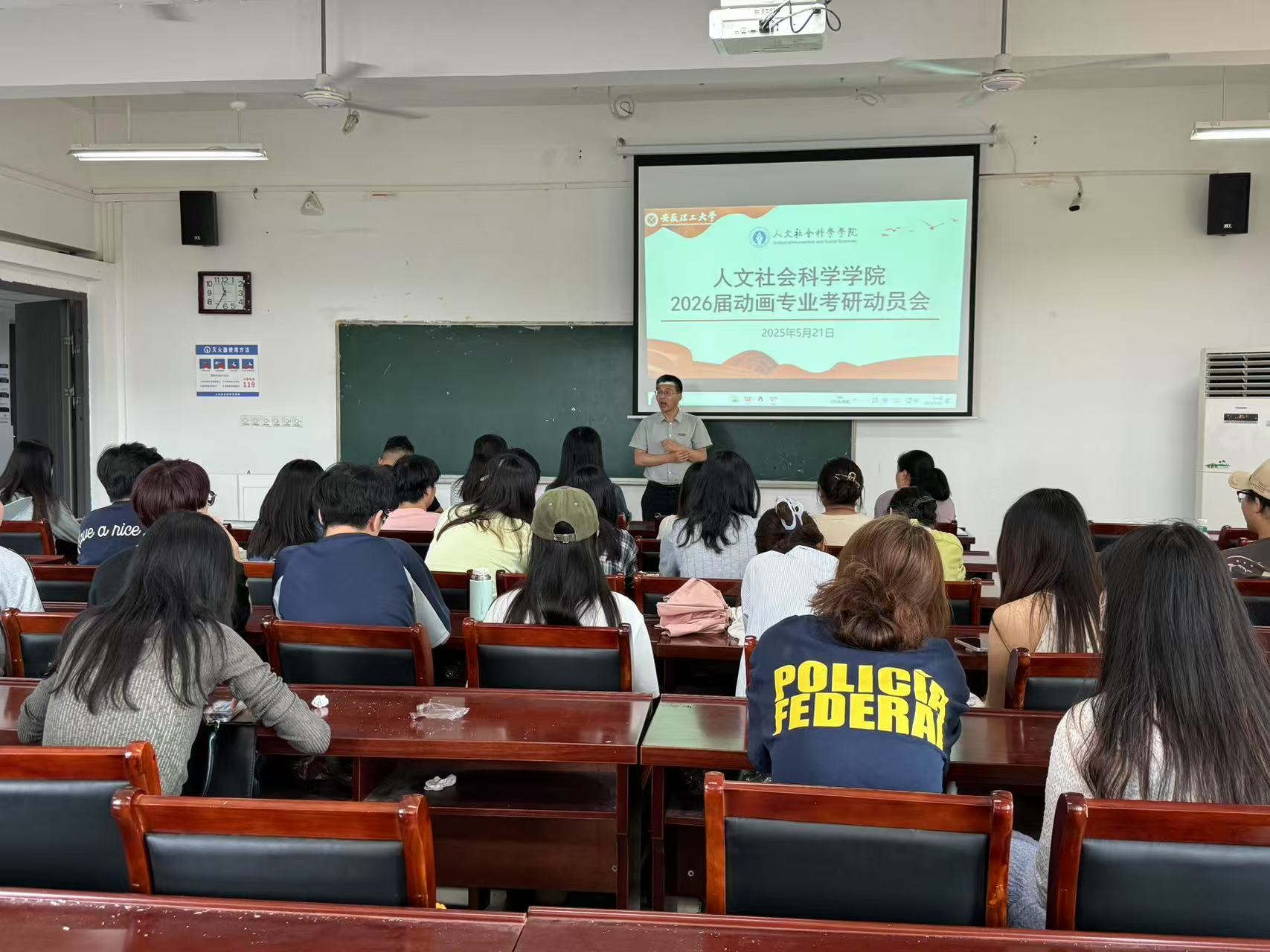 三位动画专业教师依次作考研指导,从当前考研形势分析、明确考研目标、合理选择报考院校等方面进行了详细讲解,让学生们对考研有了大致了解。2025届毕业生蒯弋锦同学采用PPT分享的形式讲述了自己的择校经验、备考时间安排、考研学习方法等。